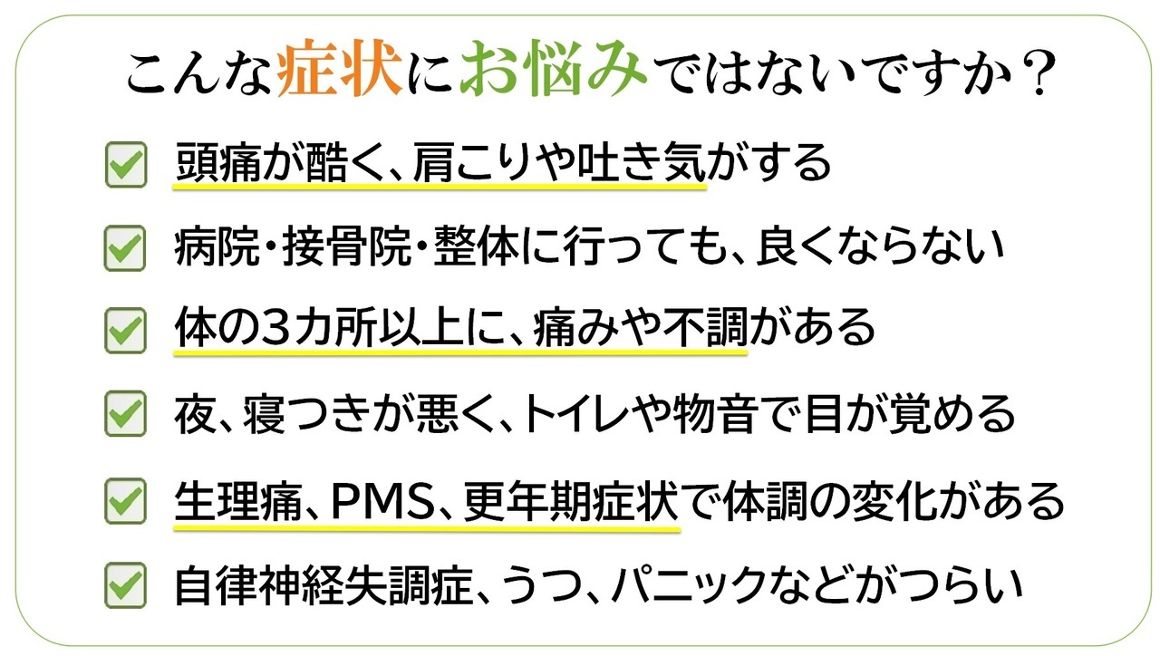 神戸市中央区の整体院|痛みと自律神経の専門家。頭痛、肩こり、肩痛、腰痛、顎関節、膝痛、自律神経、産前産後  あなたのお悩み聞かせて下さい